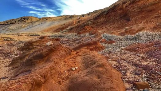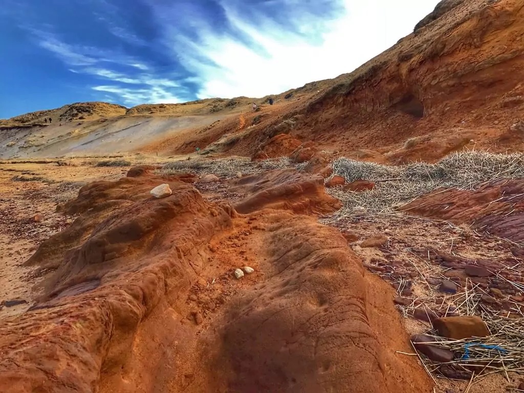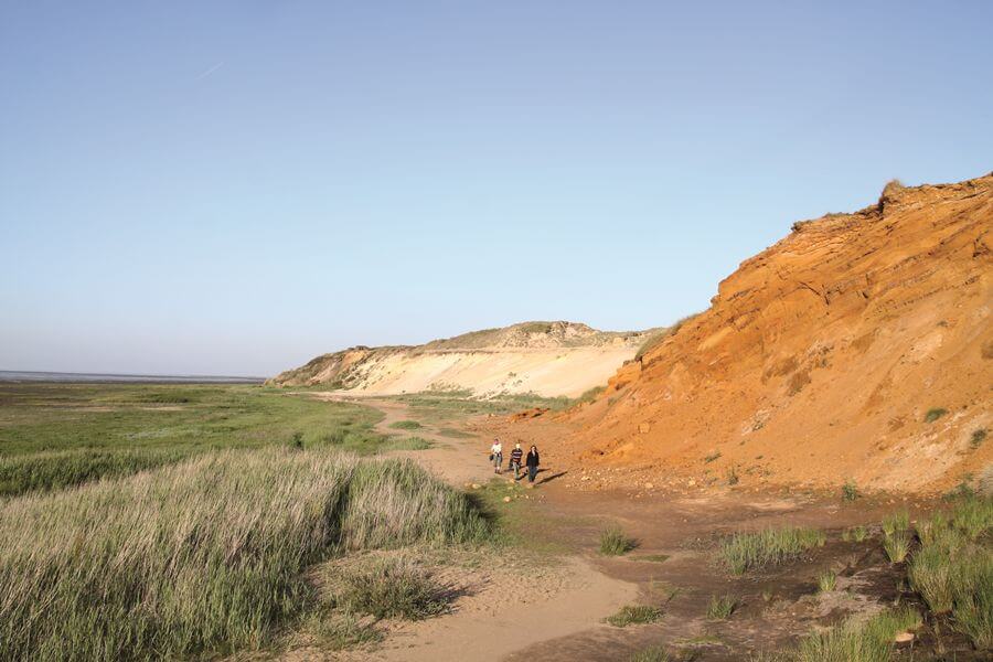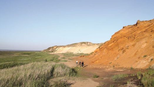 Die Erdschichten aus dunklem Glimmerton, rotem Limonitsand, weißem Kaolinsand und braungelbem Geschiebelehm geben dem Morsum Kliff sein bekanntes rötliches Erscheinungsbild.