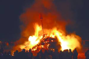 Ich war bei der Biikewache der Frauen vom Sportverein Tinnum 66 mit dabei. Für die gemütliche Stimmung und ein wenig Wärme sorgte ein kleines Lagerfeuer, auf dem bereits die ersten Tannenbäume loderten. Denn wenn es zur Biike eins im Überfluss gibt, dann ist es Brennmaterial. Bei warmen Getränken, Würstchen und anderen Leckereien wechseln sich jedes Jahr verschiedene Vereine und Gruppen ab, um die Biike möglichst rund um die Uhr zu bewachen. Da fragt man sich jetzt zurecht: Warum muss die bewacht werden? Da die Biike schon mehrere Tage im Voraus aufgeschichtet wird und jeder Ort seine eigene hat, kann es schnell zu Rivalitäten kommen. Schließlich ist jeder Ort felsenfest davon überzeugt, das beste und schönste Biikebrennen zu veranstalten. Und um die Konkurrenz einfach vorher aus dem Weg zu räumen, versucht man, die Biike der Nachbardörfer vorher abzufackeln. Was für ein Stress, wenn das Dorf in so kurzer Zeit eine neue, und wahrscheinlich kleinere, Biike aufschichten muss!