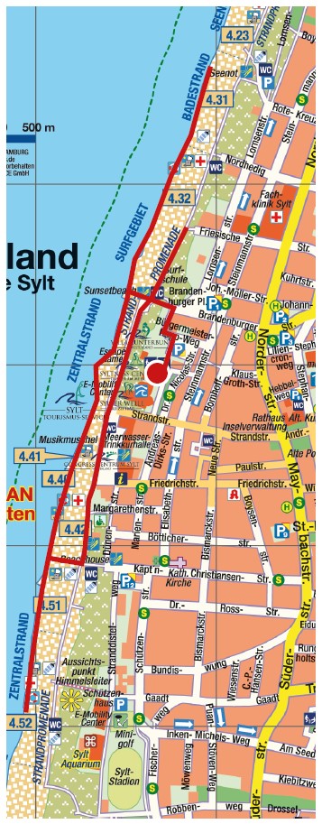 Für die Überfahrt auf die Promenade / den Strand muss der Strandübergang Brandenburger genutzt werden. Von den Abholpunkten führt der Weg über den Syltness Center-Parkplatz. Die Rollstühle haben keine Zulassung für den Straßenverkehr. Am Miettag erhalten Sie diese Karte mit der Wegführung zum Strand.
